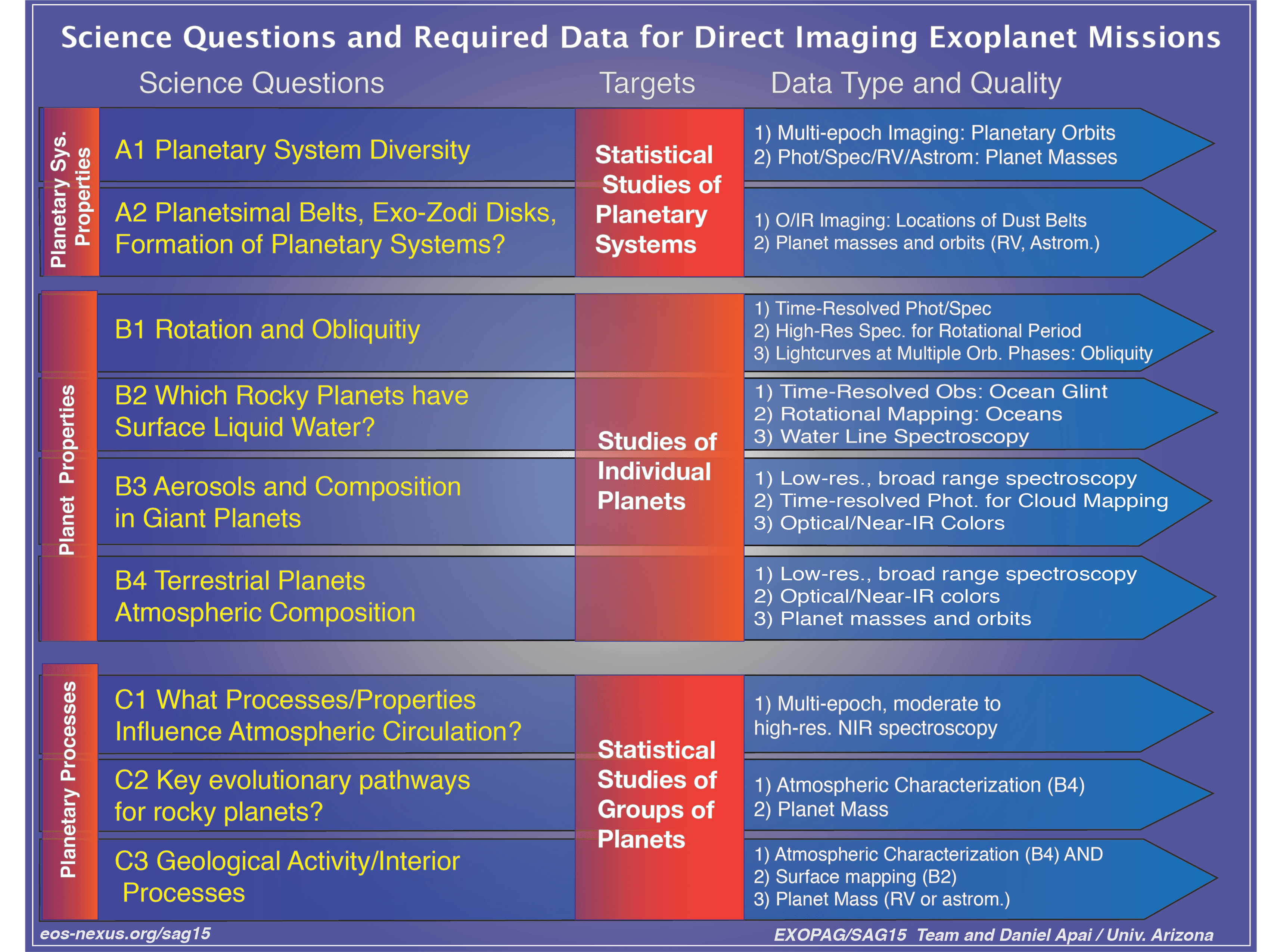 The nine questions we identified naturally fell in three categories: Questions in Category A aimed at exploring planetary systems: what are their structures, components, how do they form and evolve, what combinations of planets and planetesimal belts are common, etc. Although much progress will be made on these questions over the next two decades by telescopes being built now, we found that no telescope will be able to give us the complete picture: some will detect only close-in planets, others only dust disks, yet others only planets far out.